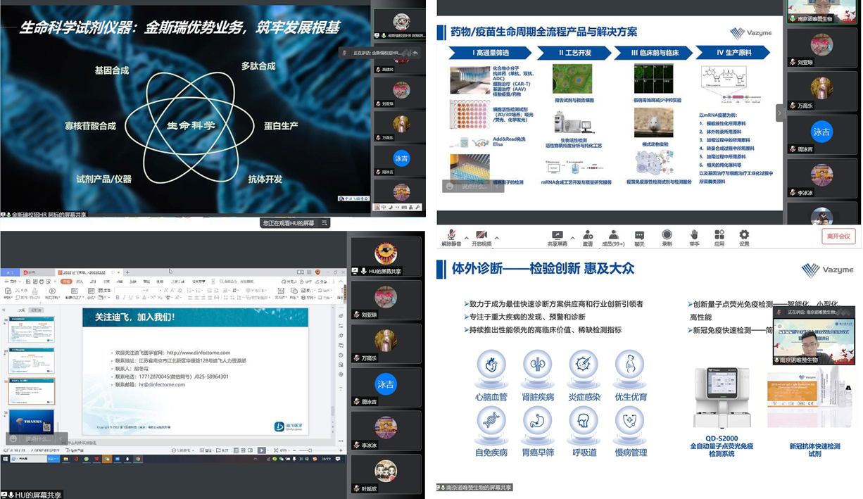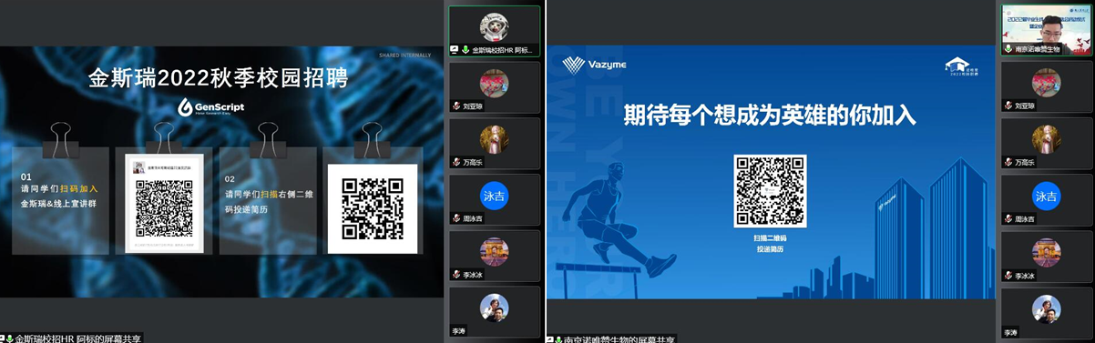 (通讯员 刘亚琼)疫情期间,BG大游集团官方网站坚持做到“防疫不见面,就业不断线”,积极探索“云就业”工作新模式。经过过去两个多月的部署与筹备,5月10日下午,BG大游集团官方网站邀请南京诺唯赞、金斯瑞、南京迪飞医学三家单位开展“云宣讲”,公司毕业论文(设计)指导导师和暂未落实毕业去向的同学约150余人齐聚“云端”三小时,满满“干货”,精准“破冰”。