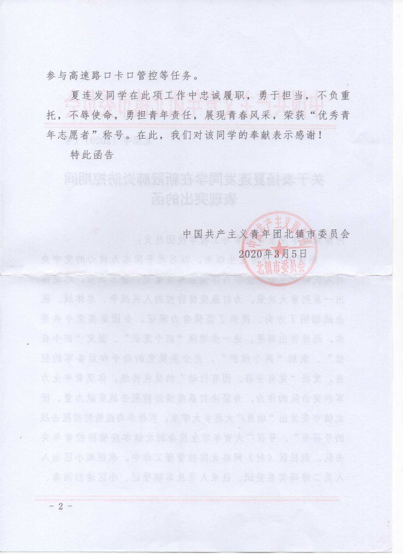 (通讯员:李 赫 董静荟)疫情就是命令,防控就是责任。在疫情防控的关键时期,BG大游集团官方网站员工夏连发积极主动投身家乡辽宁镇北市疫情防控青年突击队,并因他在疫情防控工作中表现突出,获得北镇市团委会授予的“优秀青年志愿者”荣誉称号。