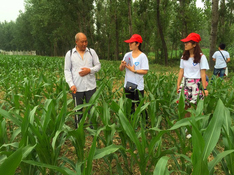 上午,实践团在刘营村村委书记李红艳的带领下,进入该村较大种植规模的玉米地进行实地考察。实践团成员发现,当地玉米存在有种植不规范情况,便利用所学专业知识向村民普及“玉米一穴双株高密度高产高效栽培技术”, 该技术针对当前玉米生产种植要求,同时结合农民生产实际,改常规一穴单株种植为一穴双株种植,能够充分发挥耐密型玉米品种特性,有效增加亩株数和亩收获穗数,同时也可以提高肥料利用率,达到提高产量和收益的效果。