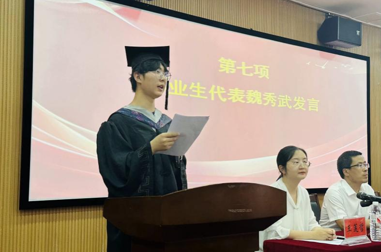 典礼上,教师代表范燕茹、毕业生代表魏秀武、在校生代表李卓迅从不同角度向毕业生分享了自己在工作、学业、生活的感悟与建议,并向毕业生表达了美好的祝福。