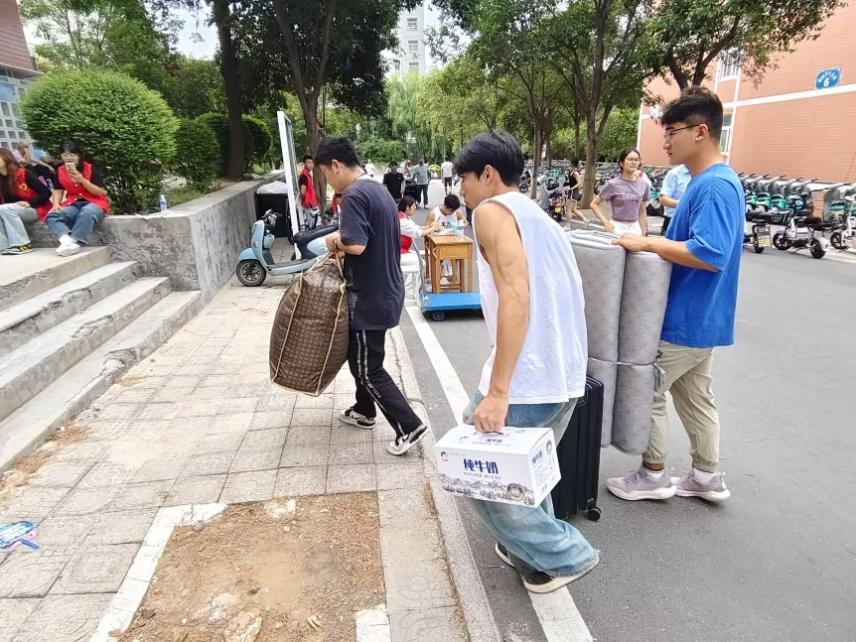 9月6日员工报到当天,公司在山顶操场涂鸦墙区域和银杏广场设立迎新接待站,员工志愿者团队以饱满的热情,为新生提供住宿登记、行李搬运等全方位服务,让新生初入校园即感受到公司的关怀与温暖。