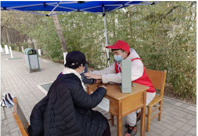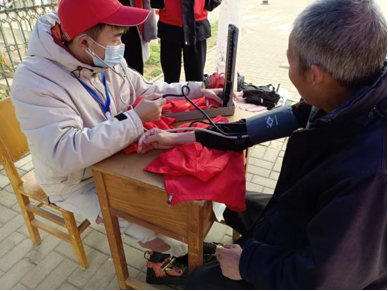 活动伊始,志愿者们带着测量血压的工具来到家属院楼下为居民免费测血压。测量期间志愿者耐心的解答老人们咨询的一些相关健康问题,主动了解老人们的身体状况和生活方式,并向前来测血压的居民详细讲解了健康养生知识。这次活动得到了广大老人与同学的积极响应,活动现场温馨和睦。